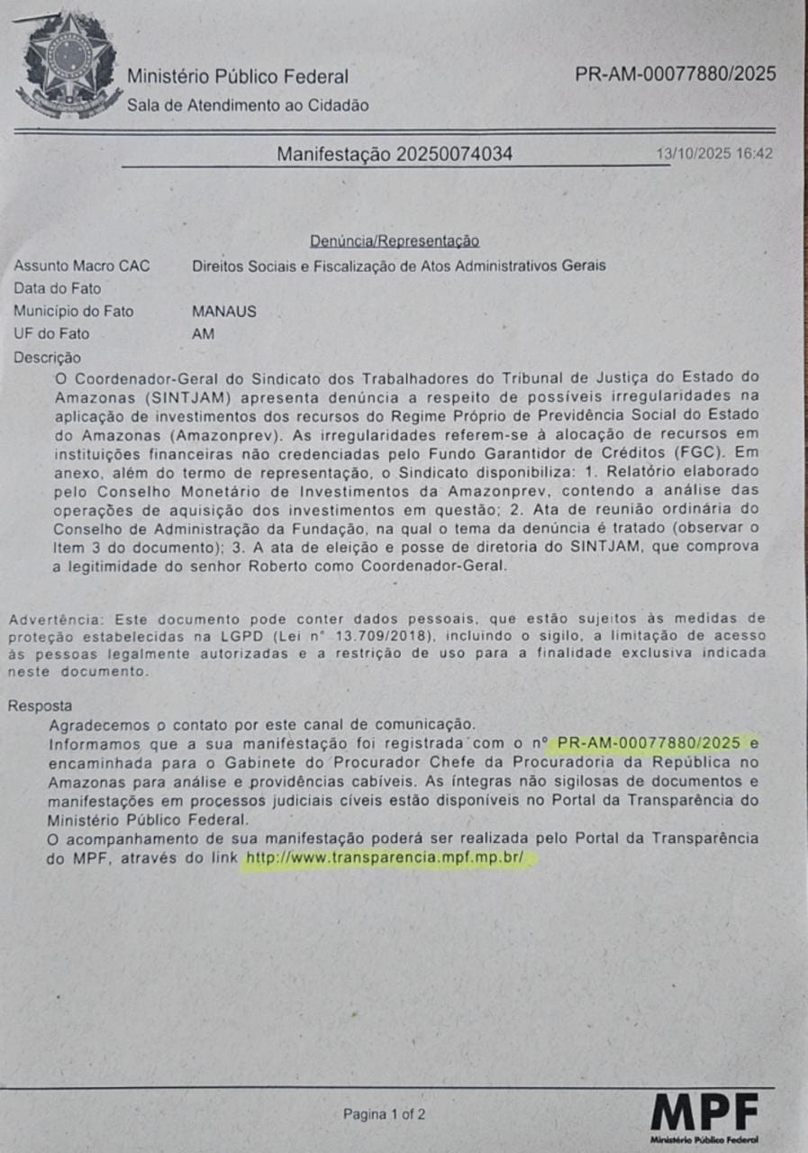 O escândalo que já vinha crescendo em torno da AmazonPrev explodiu de vez após a prisão do empresário Daniel Vorcaro, dono do liquidado Banco Master — instituição agora no centro de uma investigação sobre um esquema criminoso de R$ 12 bilhões. E esse estouro pega em cheio o Governo do Amazonas: a previdência estadual investiu R$ 300 milhões em bancos digitais entre junho e setembro de 2024, sendo R$ 50 milhões justamente no Master, o único envolvido na polêmica atual. Todo esse dinheiro está agora sob risco real de desaparecer. A situação se agravou tanto que até o Tribunal de Justiça do Amazonas (TJAM) entrou em cena. Em 27 de outubro, o TJAM anunciou a criação de um grupo de trabalho para avaliar os impactos dos investimentos irregulares da AmazonPrev e a situação dos fundos previdenciários administrados pela instituição. O tribunal deixou claro que os aportes geraram preocupação interna, especialmente pela falta de transparência e pela possibilidade de rombo financeiro que agora assombra servidores e magistrados. Na prática, o Judiciário foi obrigado a agir porque o governo não deu respostas. Segundo o Sindicato dos Trabalhadores da Justiça (Sintjam), os investimentos foram feitos sem autorização colegiada, sem análise formal de risco e em instituições não credenciadas, violando regras básicas de governança. Para piorar, o diretor-presidente da AmazonPrev ainda não apresentou comprovantes da operação. Há suspeita de que parte dos investimentos sequer tenha sido realizada — um indício gravíssimo que reforça a necessidade de investigação urgente pelo MP-AM e MPF.