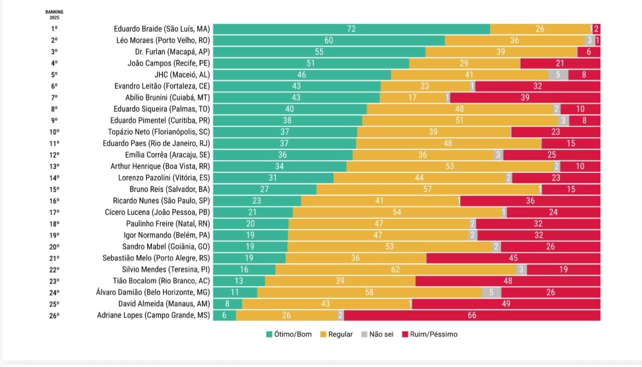 Ele registra 70% de desaprovação, ficando atrás apenas da prefeita de Campo Grande (MS), Adriane Lopes (PP), que lidera o ranking negativo com 79%.