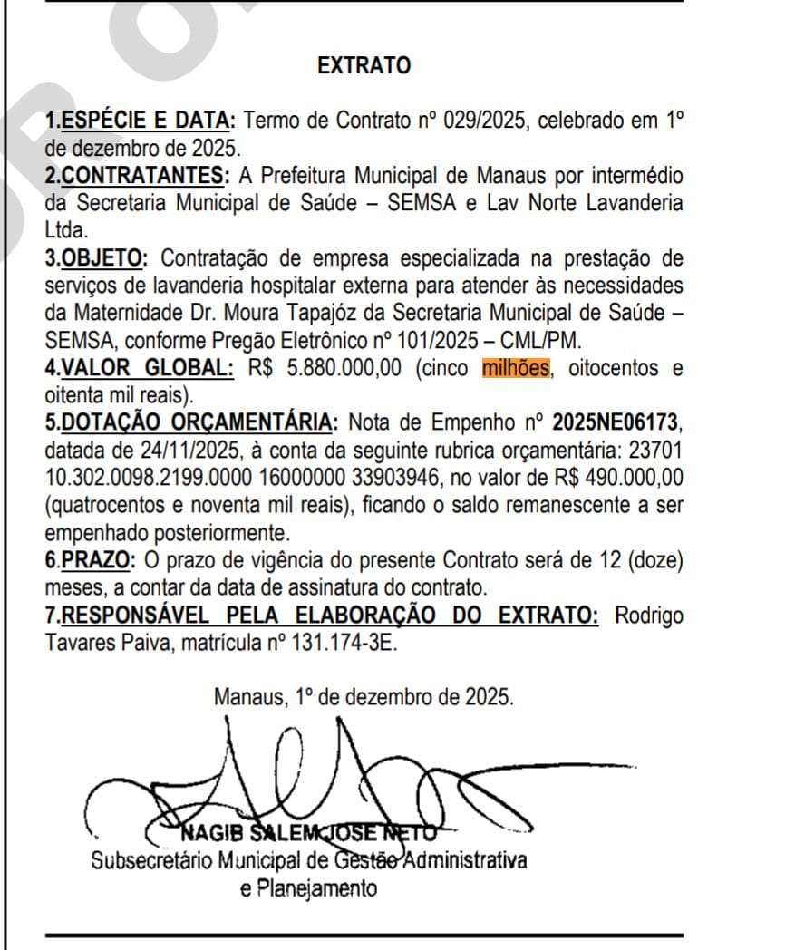 A prefeitura de Manaus assinou contrato de licitação de R$ 5.880.000,00 ( cinco milhões oitocentos e oitenta mil reais) com a empresa Lav Norte .