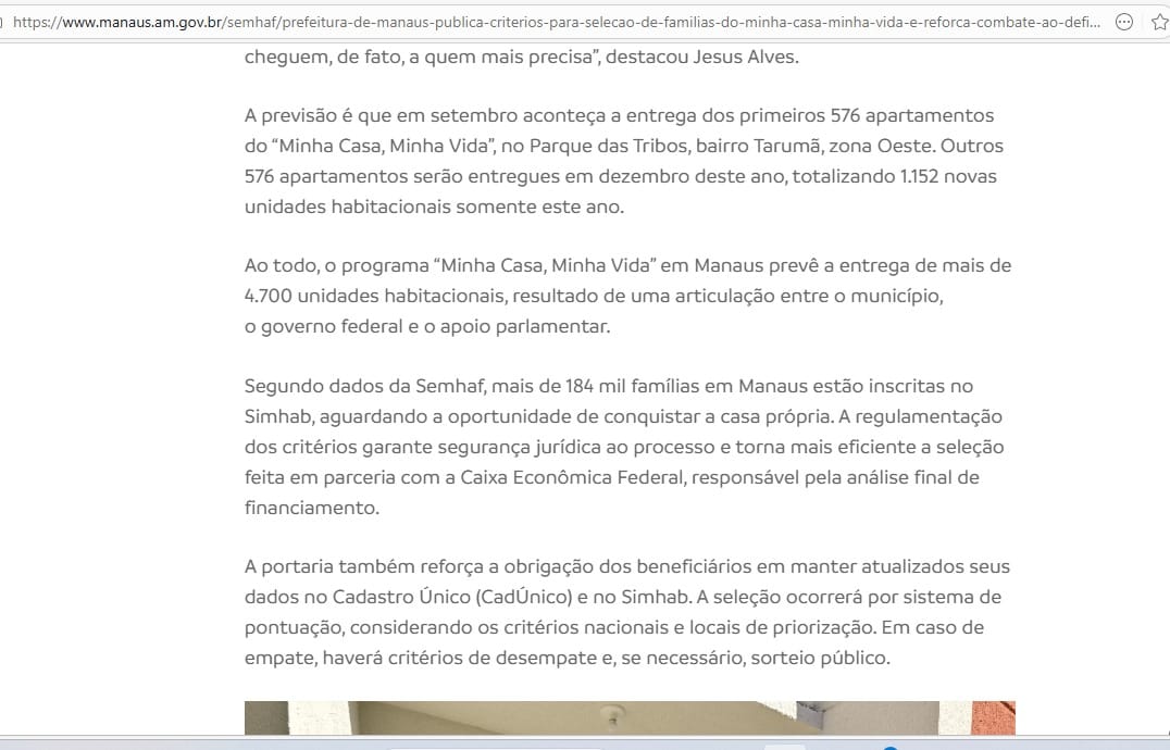 Segundo dados da Semhaf, mais de 184 mil famílias em Manaus estão inscritas no Simhab, aguardando a oportunidade de conquistar a casa própria. A regulamentação dos critérios garante segurança jurídica ao processo e torna mais eficiente a seleção feita em parceria com a Caixa Econômica Federal, responsável pela análise final de financiamento. Mesmo assim o prefeito de Manaus, David Almeida e o secretário de habitação, Jesus Alves falam em reabrir inscrições para cadastrar novas famílias.