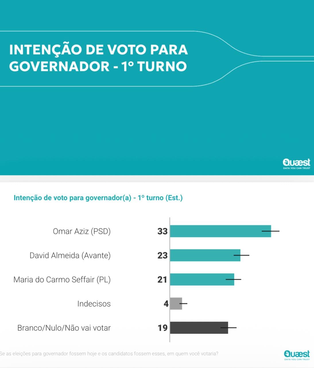 No cenário estimulado principal de primeiro turno, a vantagem de Omar se consolida. O senador atinge 33% das intenções de voto, abrindo uma distância de 10 pontos percentuais para o segundo colocado, o prefeito de Manaus, David Almeida, que marca 23%. Colada ao prefeito, aparece Maria do Carmo Seffair com 21%. Os eleitores que declaram voto em branco, nulo ou que não votariam somam 19%, enquanto os indecisos representam apenas 4% do eleitorado.