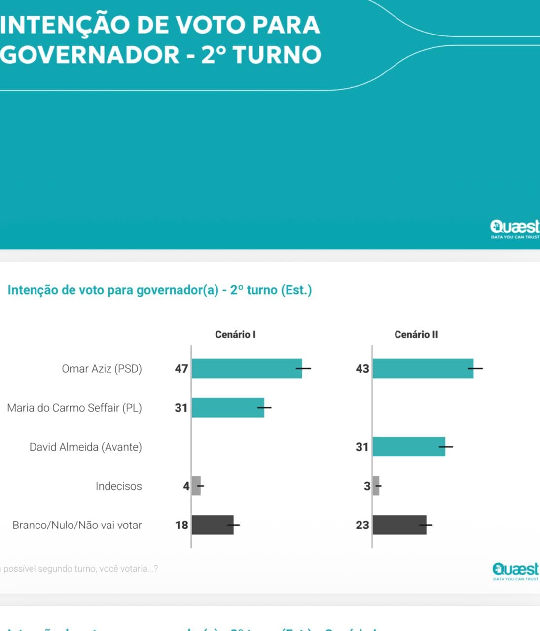 As simulações de um eventual segundo turno reforçam o favoritismo de Omar Aziz, mostrando que ele venceria seus dois principais adversários com folga: contra Maria do Carmo, Omar sairia vitorioso com 47% dos votos contra 31%; contra David Almeida, Omar também superaria o atual prefeito de Manaus em um embate direto, registrando 43% das intenções de voto contra 31% de Almeida.