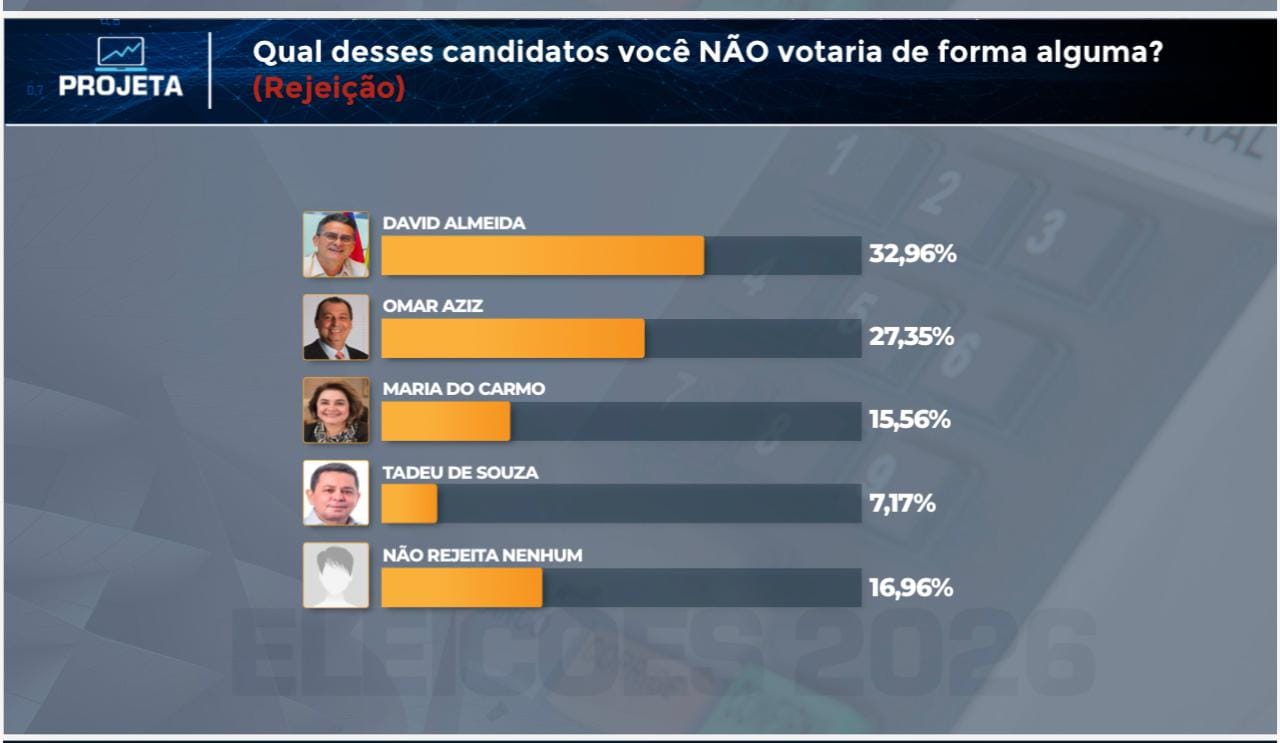 A mesma pesquisa revela um indicativo de sua avaliação perante ao eleitor amazonense, David Almeida é o mais rejeitado pelos entrevistados com 32,96%.