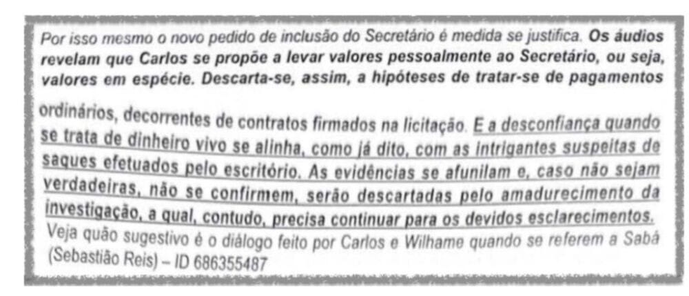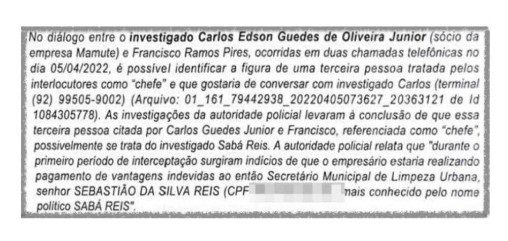 Interceptações telefônicas autorizadas pela Justiça revelam conversas entre Sabá Reis e Carlos Edson de Oliveira Junior, sócio da Mamute. As gravações indicam que o empresário ofereceu valores em espécie ao secretário. Nas ligações, Sabá Reis é tratado como "chefe", sugerindo que ele teria recebido "vantagens indevidas" em troca de favorecimento nos contratos públicos.