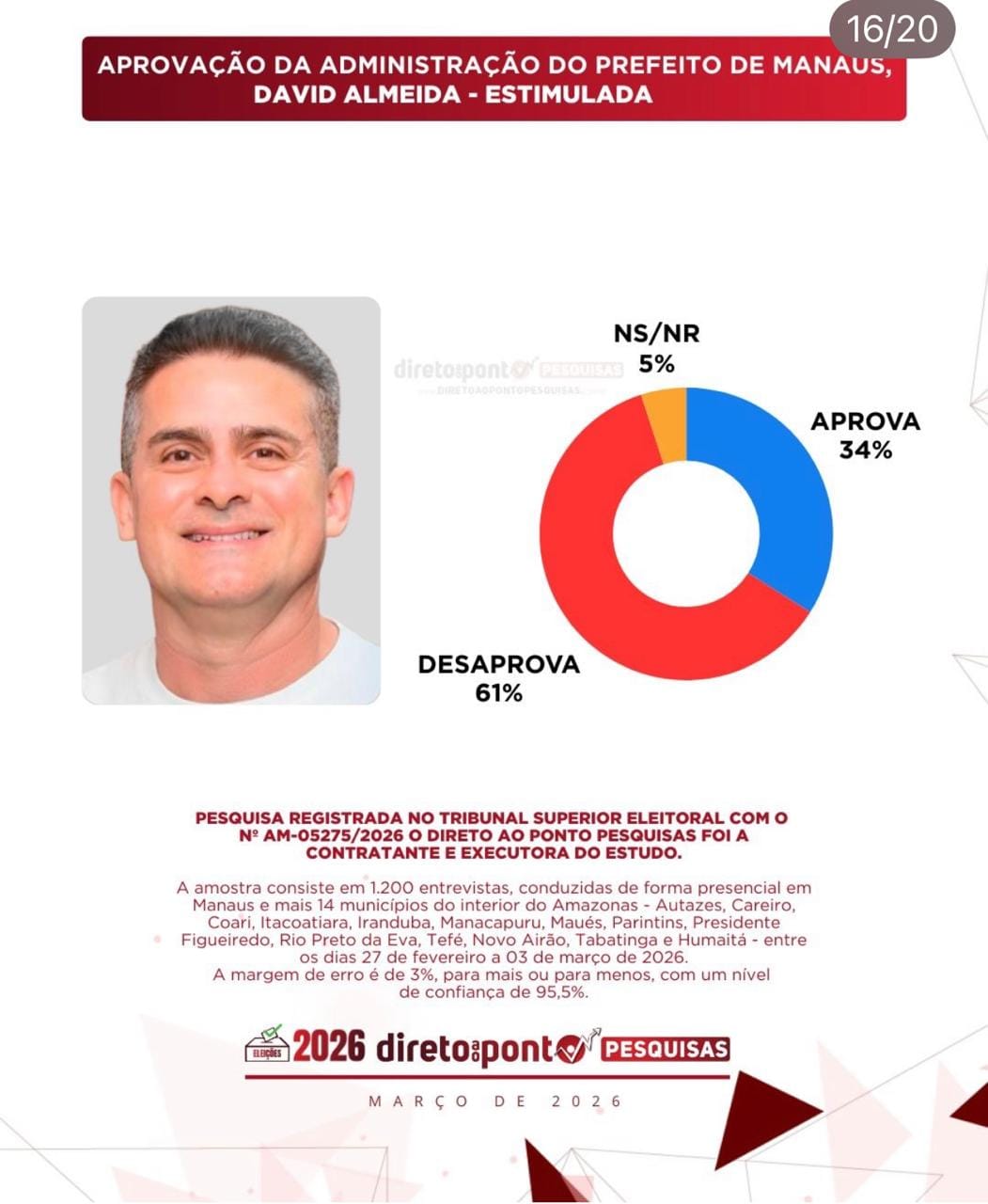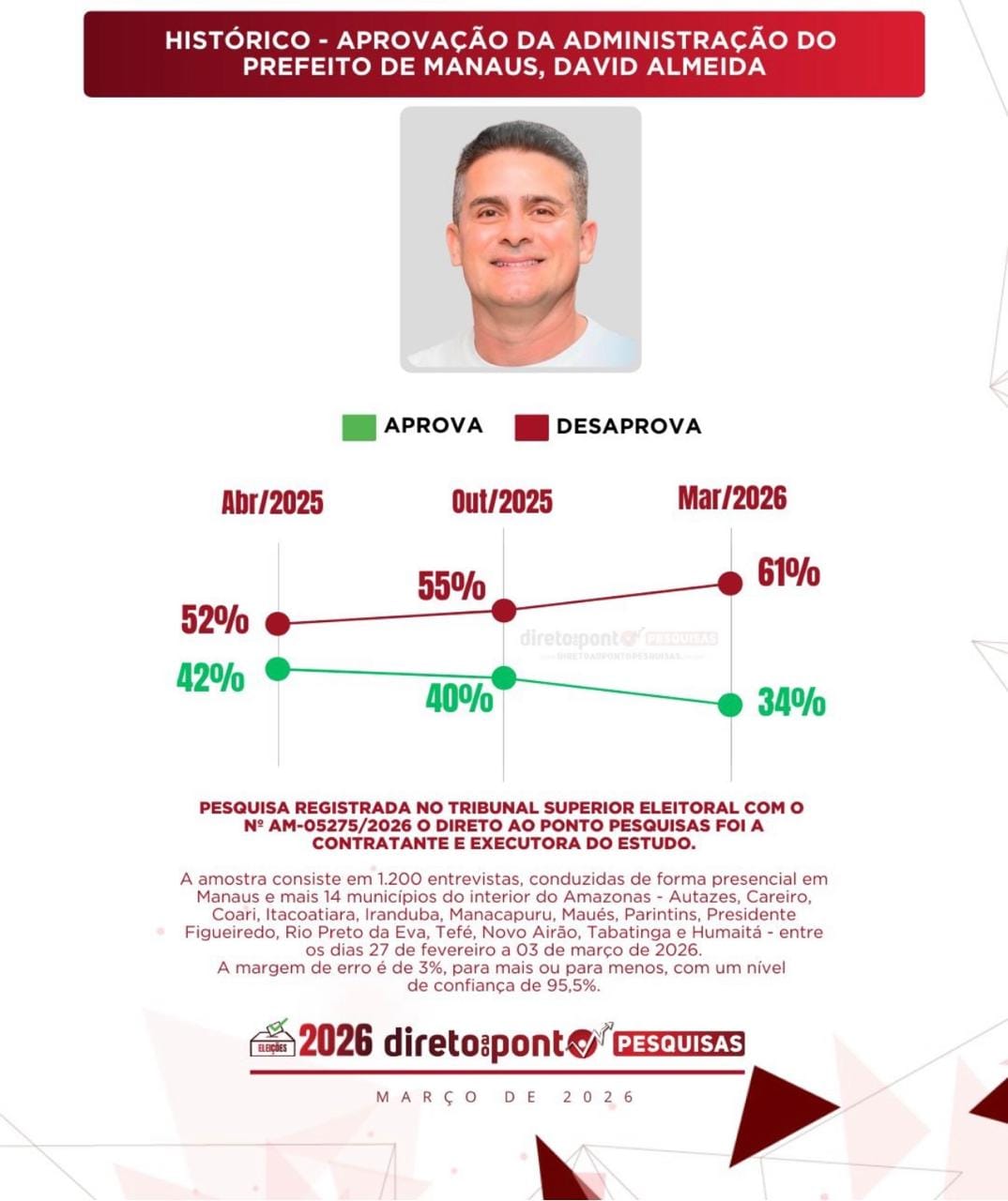 Além disso, a avaliação da administração municipal apresenta índices negativos. Segundo o levantamento, 61% dos entrevistados desaprovam a gestão de David Almeida, enquanto 34% aprovam.
