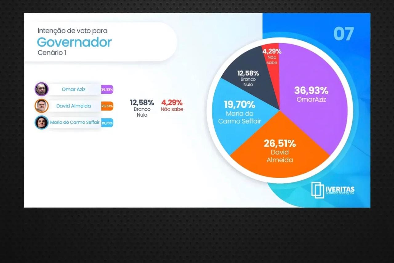No cenário estimulado para o Governo do Amazonas, o senador Omar Aziz aparece na liderança com 36,93% das intenções de voto. Em seguida, o prefeito de Manaus, David Almeida, registra 26,51%, enquanto a Professora Maria do Carmo Seffair alcança 19,70%. Os votos brancos e nulos somam 12,58%, e 4,29% dos entrevistados afirmaram não saber ou preferiram não responder.