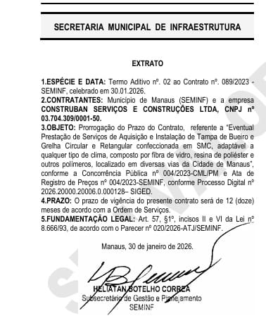 A Prefeitura de Manaus prorogou por mais 12 meses o conttrato de R$ 58,1 milhões com aquisição e instalação de 4.875 tampas de bueiro e grelhas circulares e retangulares de SMC [fibra de vidro e resina de poliéster]. O registro de preços da Concorrência nº 004/2023-CML-PM é para obtenção conforme a necessidade. Não implica o gasto total do valor reservado.