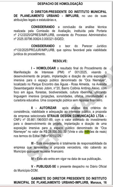 A Prefeitura de Manaus por meio da Secretaria de Planejamento Urbano- IMPLURB, homologou contrato para implantação da exposição "Oca Niemeyer", com empresa sediada em Curitiba, Straub Desing Comunicação Ltda. por R$ 28 milhões.