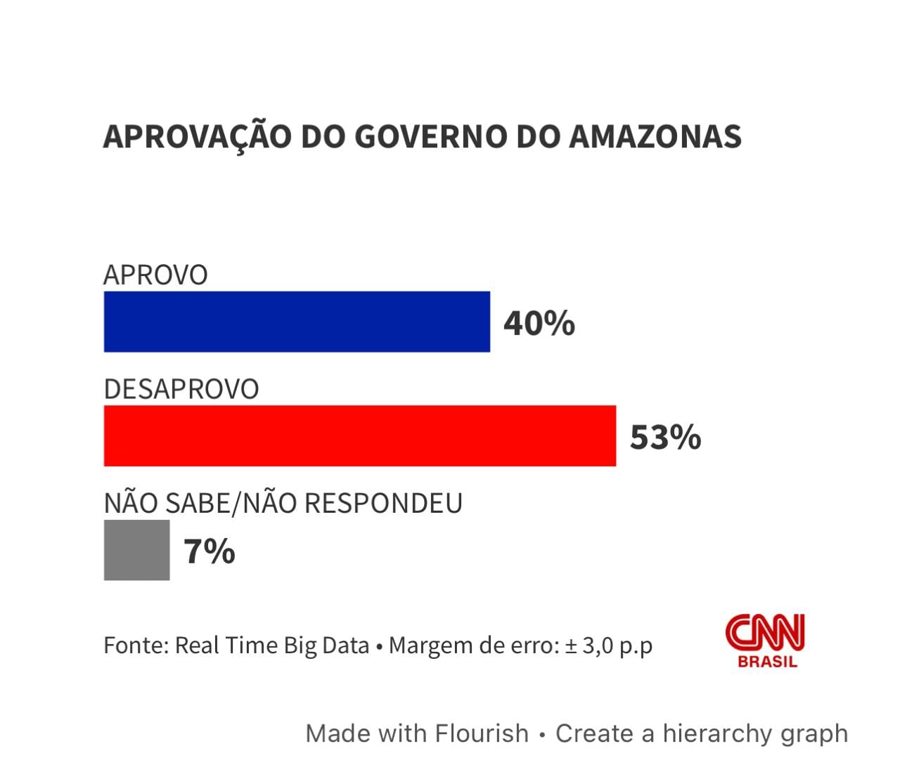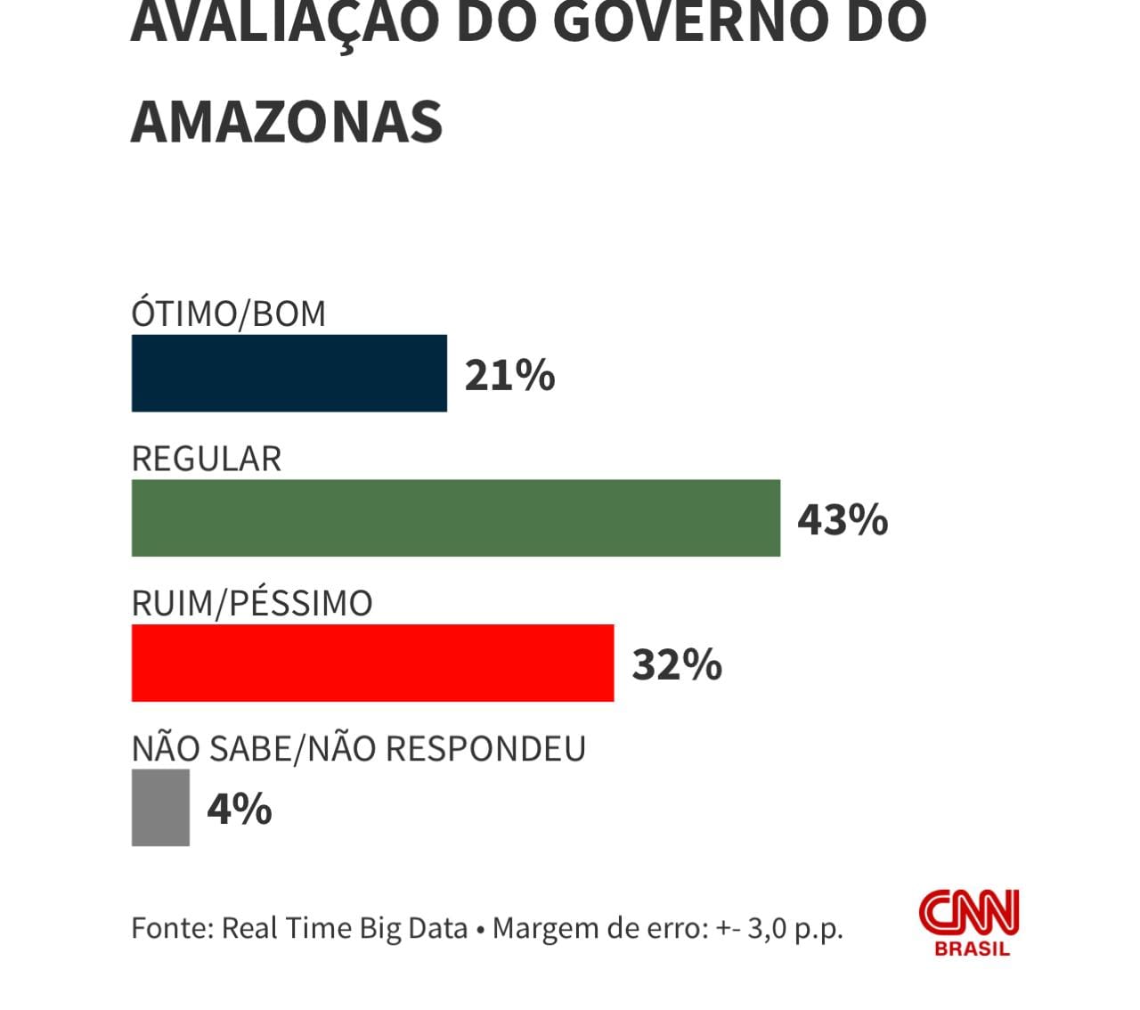 A gestão do governador do Amazonas, Wilson Lima (União), é desaprovada por 53% dos eleitores do estado e aprovada por outros 40%, segundo levantamento do instituto Real Time Big Data/CNN Brasil divulgado nesta segunda-feira (15).