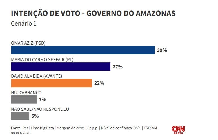 Pesquisa Real Time Big Data divulgada nesta quinta-feira (19) aponta que o senador Omar Aziz (PSD) lidera os cenários de primeiro e segundo turno na disputa pelo governo do Amazonas nas eleições deste ano.