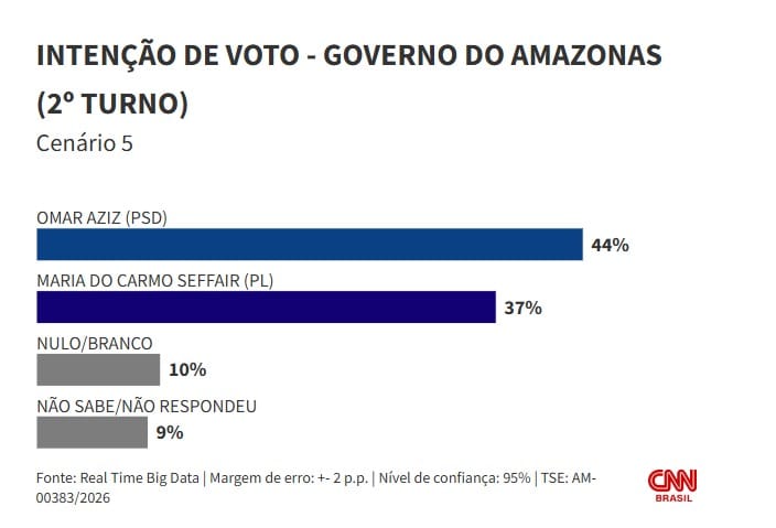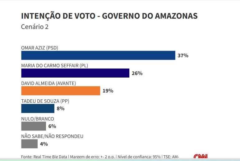 No segundo cenário do levantamento, Aziz permanece à frente, com 37% das intenções de voto, seguido por Seffair, que tem 26%. Almeida aparece em terceiro, com 19%, e o atual vice-governador do Amazonas, Tadeu de Souza (PP), surge com 8%.