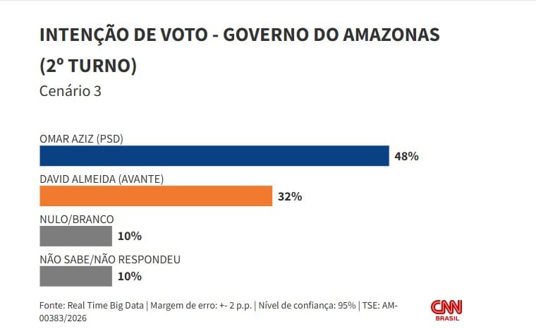 Já em um eventual segundo turno das eleições entre Aziz e Almeida, o senador fica com 48% das intenções de voto contra 32% do prefeito da capital amazonense. 10% dos eleitores responderam que votariam em branco ou nulo, assim como os que não sabem ou não responderam.