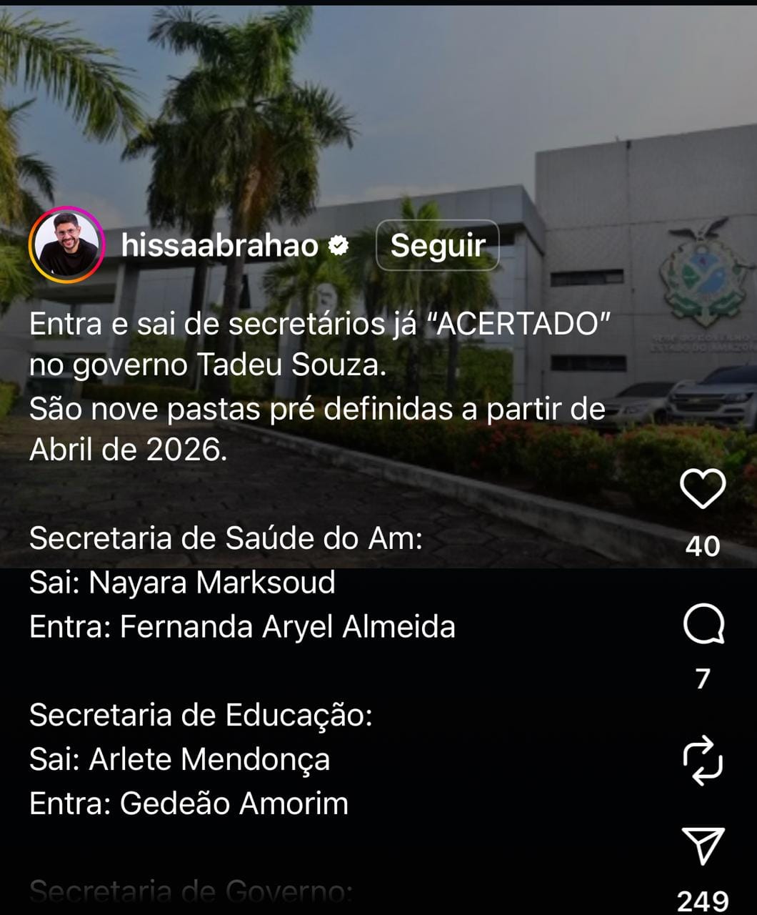 Segundo o analista político Hissa Abrahão, o vice-governador Tadeu de Souza já tem um esboço do seu secretariado para seu governo tampão, caso o governador Wilson Lima renuncie para disputar a eleição ao Senado em 2026.