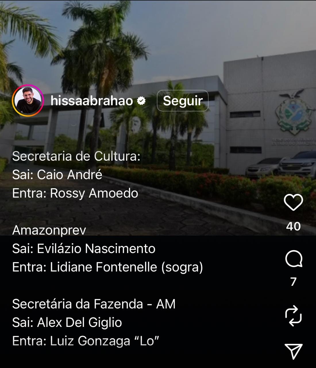 Os nomes constam a filha de David Almeida, Fernanda Aryel para se secretaria de Saúde. Seu sogro Gedeão Amorim para a Seduc. Lidiane Fontenelle, sogra de David, para o Amazonprev.